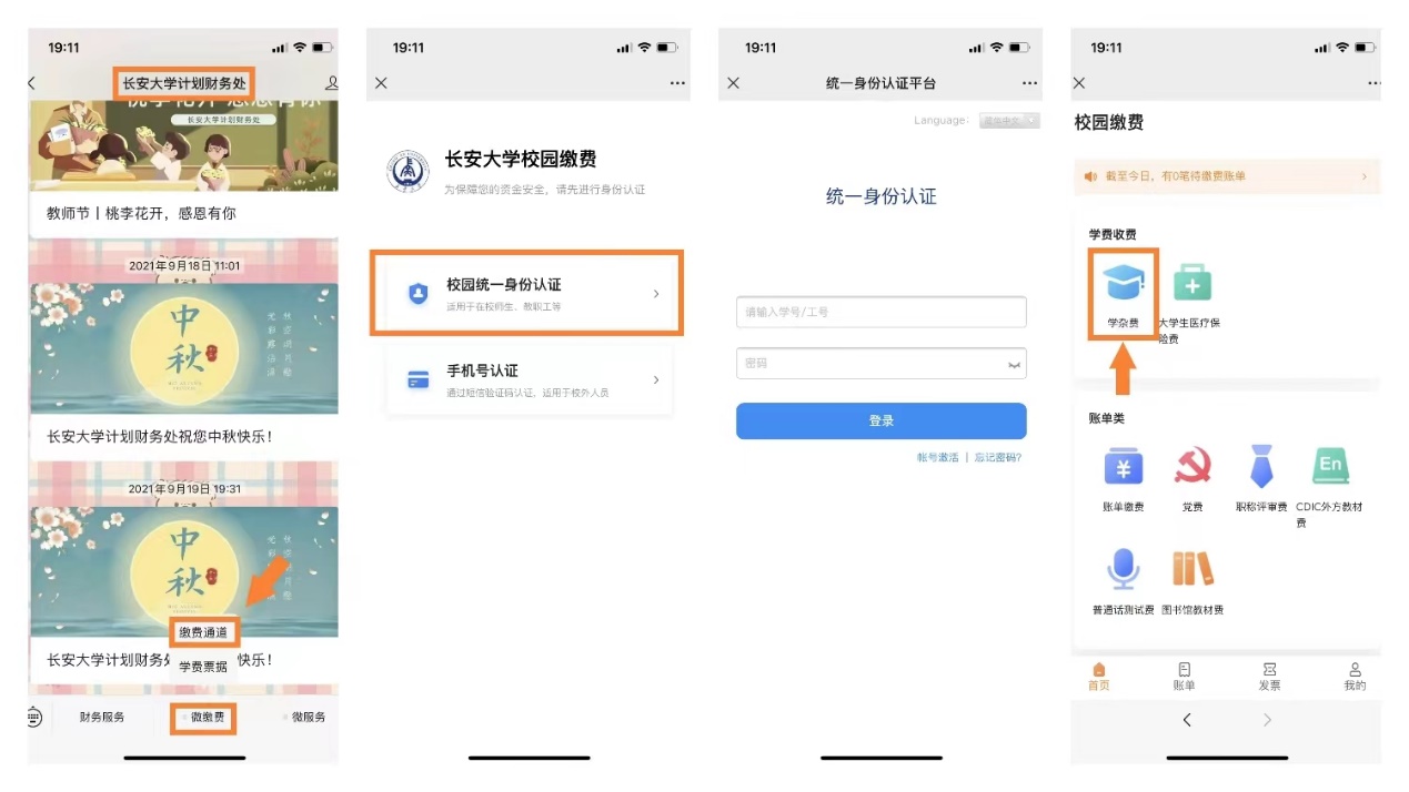 学费补缴流程:关注“bwin必赢国际中国官方网站计划财务处”公众号(chdjcc),第一步 “微缴费--缴费通道--校园统一身份认证--账号激活”在激活中设置密码;第二步“微缴费--缴费通道--校园统一身份认证--输入学号和密码--学杂费”进行缴费。